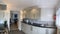 Modern kitchen includes fridge freezer, cooker, hob and microwave. A small utility room holds a washing machine.