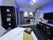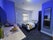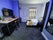 Furnished with bed, chest, shelves, and clothes storage, plus TV and work station with seating.