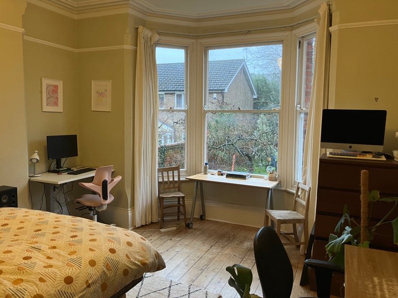 The house is big and Victorian and a little rough around the edges. We have a nice big back garden for summer barbecues and winter fires, a veg patch, a garage for storing bikes and camping gear, a cellar for general storage, big spacious kitchen-living area, a wood-burner, broadband, and loads of other nice features. We have a good relationship with our Landlady. There's free street parking outside the house, with plenty of space.