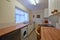 Modern kitchen with oven, 4-ring hob, microwave, fridge freezer, and washing machine. Relax in the comfortable lounge with sofa and flat-screen Smart TV.