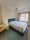 A 110x200cm size bed with a new firm mattress, duvets, bedding, and pillows.