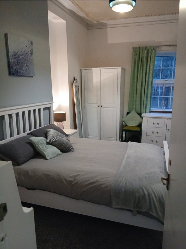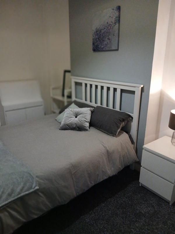 The first of 4 x Double rooms, in a clean, warm, friendly house, The room is a good size double due to being on the ground floor, freshly painted, you can easily change bedding colour to your choosing if needed. We supply either grey first photo or pink bedding, last photo. Bathroom also on the ground floor. Shared kitchen, starter items supplied. Lovely shared living room. It is £560 for a single person. Depisit £560.