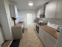 The new kitchen has a fridge with freezer compartment, oven, hob, extractor, large microwave and lots of kitchen cupboards.