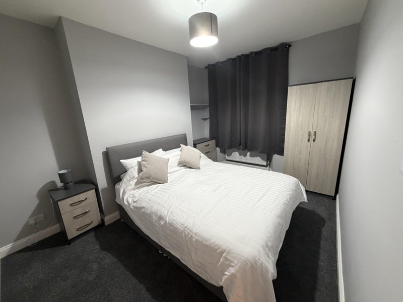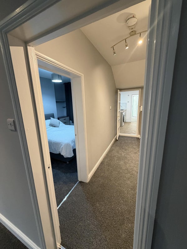 There is a large hallway which leads to the bedroom, which comes with a high end king size bed, wardrobe, draws and bedside table.