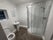 There is a new bathroom with a shower, sink and toilet.