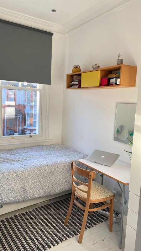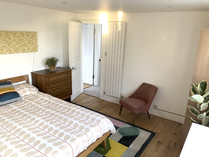 The room is a large double at the top of the house so it’s pretty quiet and away from the rest of the house. It’s fully furnished with a solid oak floor, double bed, wardrobe, long sideboard, drawers and a dressing table. Also has double glazed sash windows so no draughts in the winter.