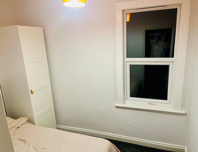 Brand new bed (small double), mattress & bedding. Bedside table with lamp and clothes rail. TV inc Netflix and Prime.