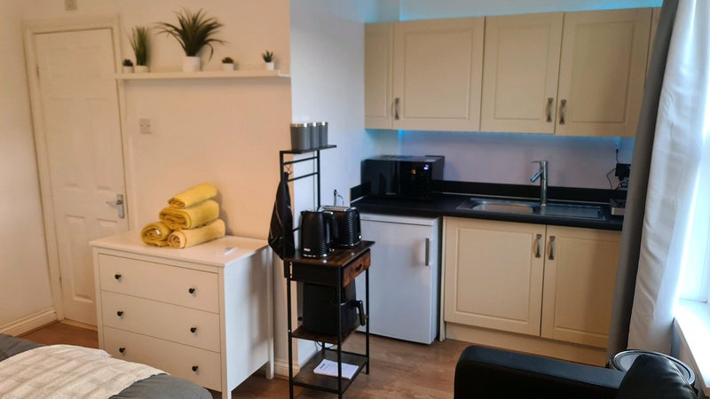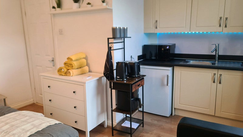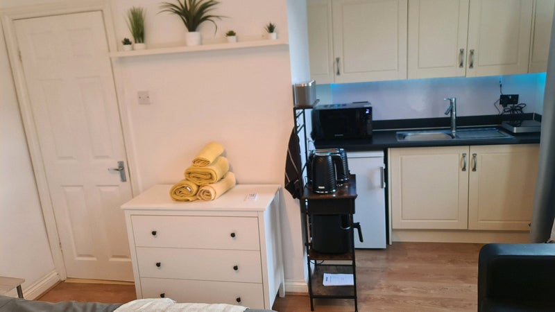 This bright and welcoming studio is fully equipped and move-in ready, with fresh bed linens, towels, and essential amenities including shampoo, cutlery, pots and pans, and full cooking facilities. You’ll also have access to an air fryer, induction hob, microwave, toaster, and kettle – everything you need for comfortable and effortless self-catering during your stay.