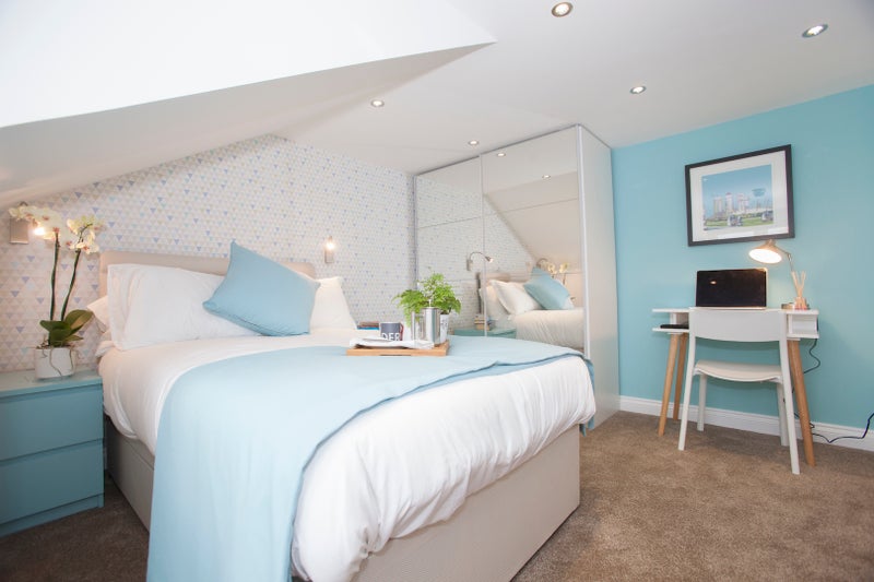 - Double bed with reading lights, wardrobe, desk, chair, wall mounted Smart 32 TV