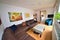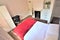 > Double Room is furnished with a double bed, wardrobe, desk, drawers and a chair. Desk can be upsized