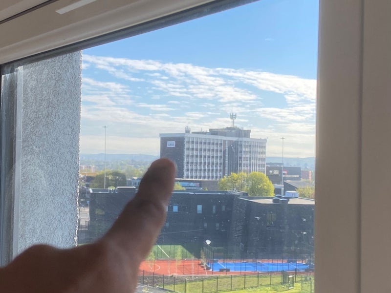 * Walking distance to the University of Salford campus – university buildings are visible from the window.