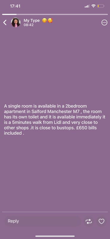 A double room is available in a 2bedroom apartment in Salford Manchester M7 , the room has its own toilet and it is available from the 20th of January, it is a 7minutes walk from Lidl and other shops .it is close to bustops. £650