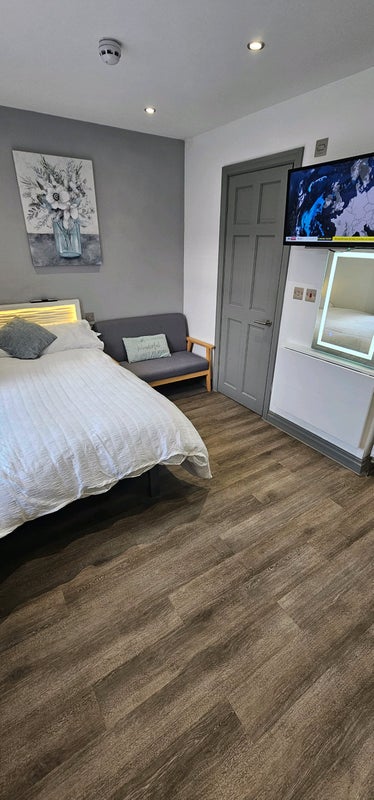 New Studio Room with en-suite bathroom. Conveniently it is fully furnished, with an airfryer, fridge, microwave, kettle, toaster, George Foreman grill, slow cooker, cutlery, dinnerware, Smart TV, microwave, sofa, desk and chair all provided.