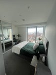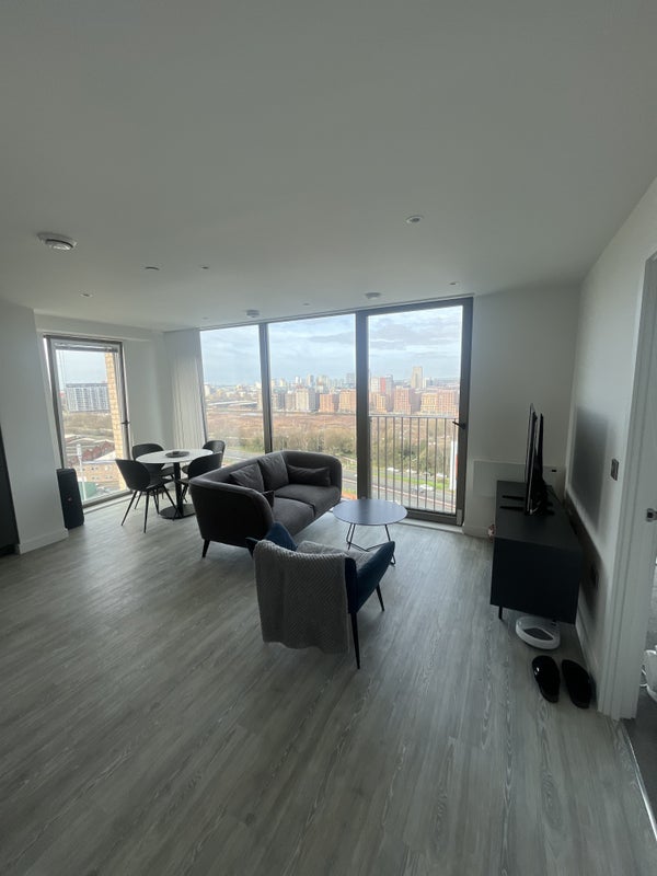 The room is a spacious double with its own private en-suite, in a high-floor flat with stunning city views through floor-to-ceiling windows. The flat has a bright, open-plan kitchen/living area with a relaxed feel throughout.