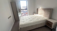 Has a wardrobe with full length mirror, double size bed and room to fit a 120cm desk.