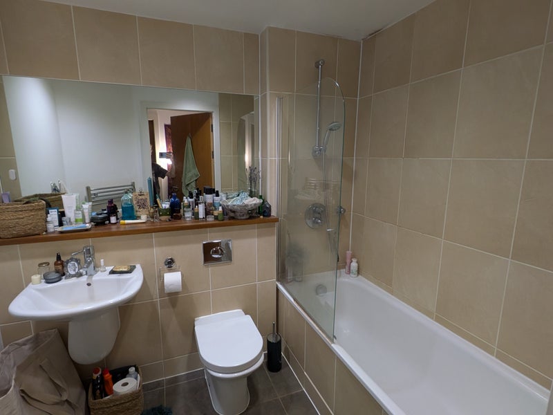 The bedroom is fully furnished with a nice view of the courtyard, the larger bathroom (with bath, shower, toilet) would be yours as the other bedroom has an ensuite (photos show current housemate’s belongings, room will be undecorated and ready for new occupant). Shared living area has a large kitchen with plenty of counter space and storage - includes oven, electric hob, dishwasher, fridge/freezer etc. Lounge is furnished with 2 big sofas, an armchair, coffee table and stand for a TV, there is also a dining table. Windows face out into the courtyard which has trees and flower beds. Washer/dryer also included (see additional information for wifi).