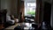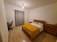 The bedroom comes furnished with a Queen-size bed, large drawers, bedside table, desk (with wheeled chair) and built-in wardrobe with wood flooring throughout. Located on the First Floor, there is a large window, with a heavy curtain and a white net curtain, that looks out onto the street with view of the Sheffield skyline.