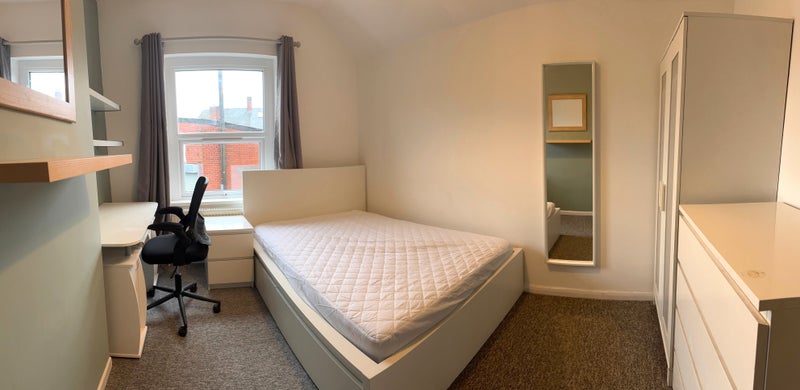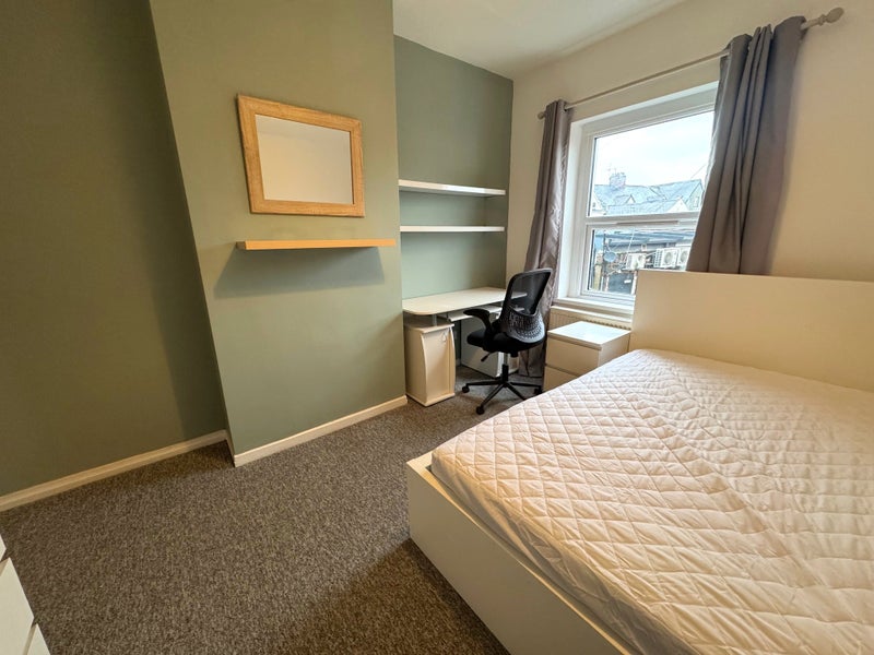 Room features double bed, wardrobe, chest of drawers, bedside cabinet, desk, office chair, wall shelves and or bookcase. All with new carpets, beds, desks and chairs and newly redecorated.
