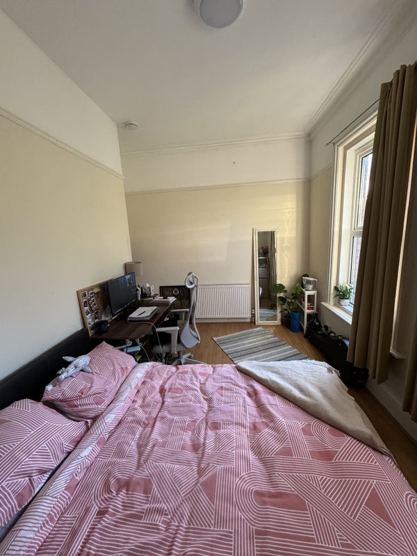 Quiet large first floor room with double bed in a shared house of post grads with separate large lounge, kitchen, spacious entrance hall and courtyard to the side and garden at the rear.