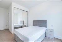Ensuite bedroom in a modern 2b2b flat available from May 1st. Lease ends January 16, 2027 but early termination is possible with two months’ notice. The building includes a residents’ gym, lounge area, co-working space with meeting rooms, games room, and a roof terrace. There is secure parcel storage, bike storage, and an onsite management team. WiFi is available in the communal areas.