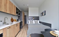 The studio is 17m² with a private kitchen (Bosch/Indesit appliances), en-suite bathroom, double bed, desk, and superfast 1GB WiFi.