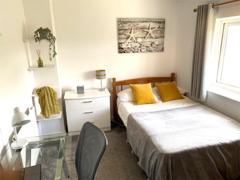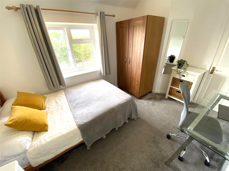 The lockable room as a double wardrobe, 4ft double bed, modern glass desk with chair on wheels, shelves, 2 chests of drawers, long wall mirror and venetian wooden blinds with curtains.