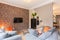 The house also includes a spacious living room with comfortable sofas and a TV, perfect for relaxing or socializing.