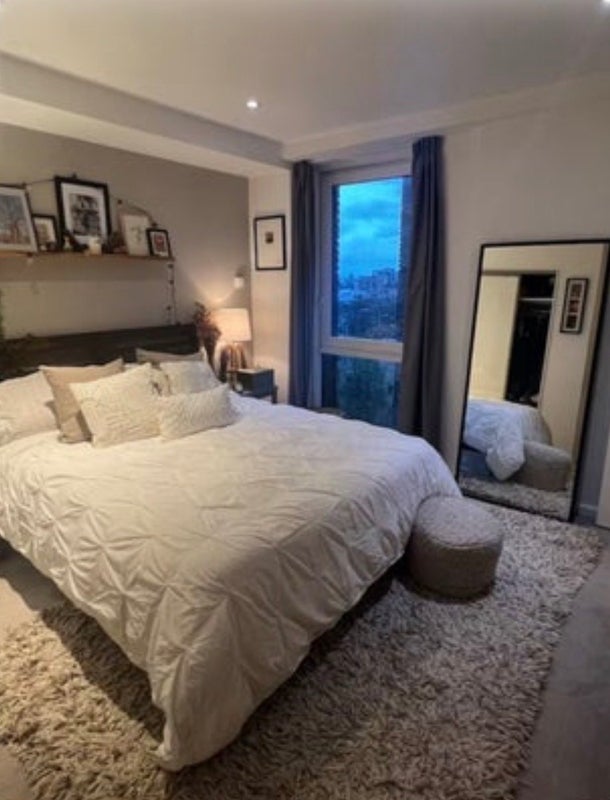 A bright and spacious king-size double en-suite room is available in a fully furnished, modern top-floor high-rise apartment with no adjacent neighbours, making it exceptionally quiet and private, with two large balconies and uninterrupted views across East, South and West London, including stunning sunsets over the city.