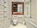 The bathroom features large-format porcelain tiles, natural stone wall detailing, a steel enamel bath with glazed shower screen and wall-mounted shower head.
