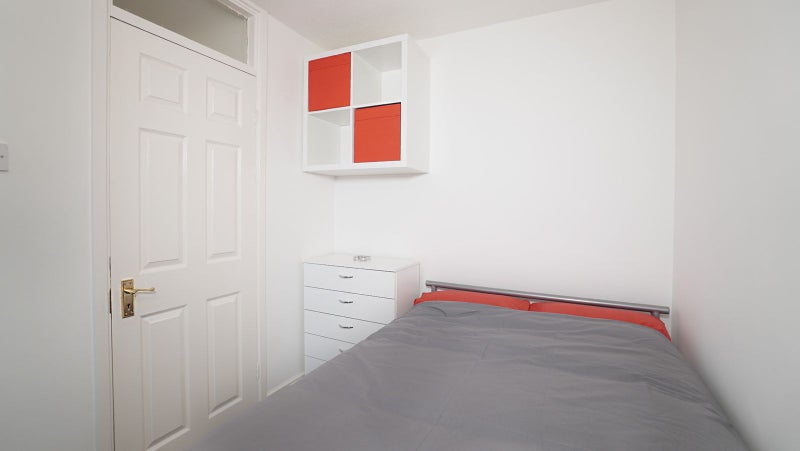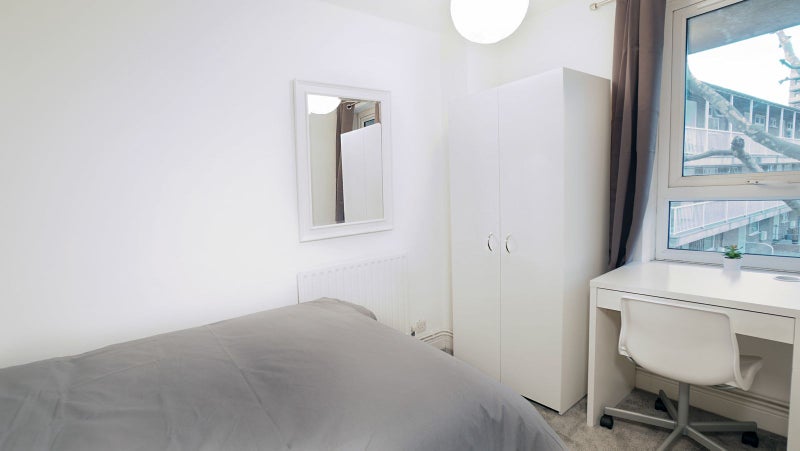 The bedroom is bright, spacious and comfortable. A large window lets in plenty of natural light, helping the room feel airy and welcoming. It comes furnished with a large wardrobe for storage as well as a desk and chair — ideal if you work or study from home. There is also ample floor space so the room never feels cramped.