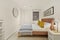 Furniture: Built-in large wardrobe, nightstand with bedside lamp, and a white tall chest of drawers for personal storage.