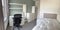 Room features double bed, wardrobe, chest of drawers, bedside cabinet, desk, office chair, wall shelves and or bookcase. All with new carpets, beds, desks and chairs and newly redecorated.
