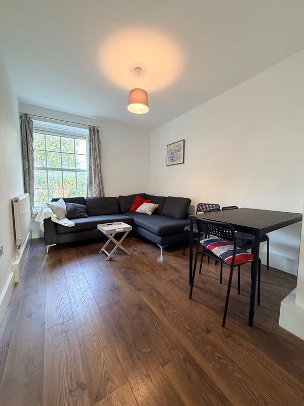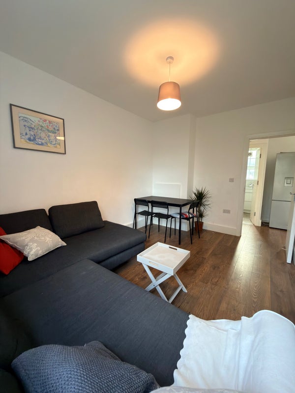 You will share a modern living room with a large corner sofa, dining area, and wooden flooring throughout, creating a warm and inviting atmosphere. The flat also includes a fully equipped kitchen and a well-maintained bathroom.