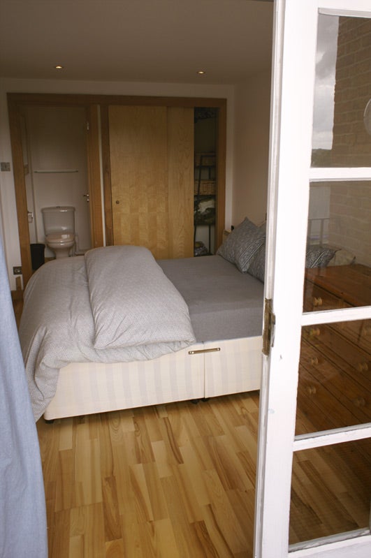 Bright, south-facing double bedroom with en-suite bathroom and double French doors onto balcony facing the park. Room comes furnished with built-in closet, double bed and chest of drawers plus optional desk.