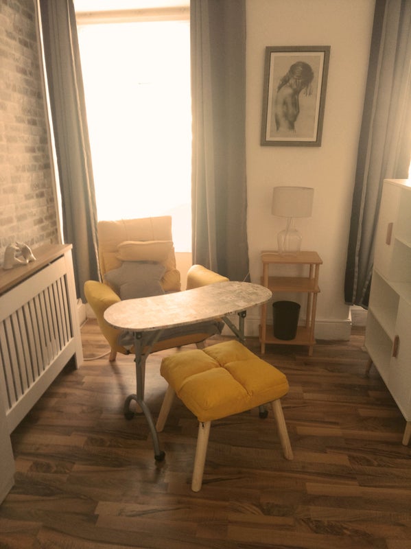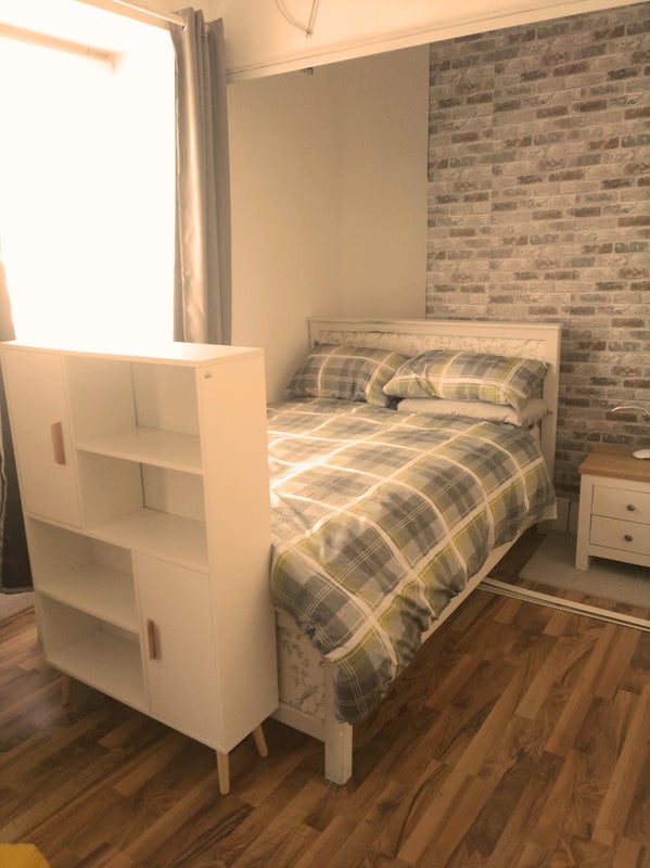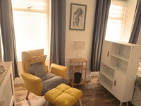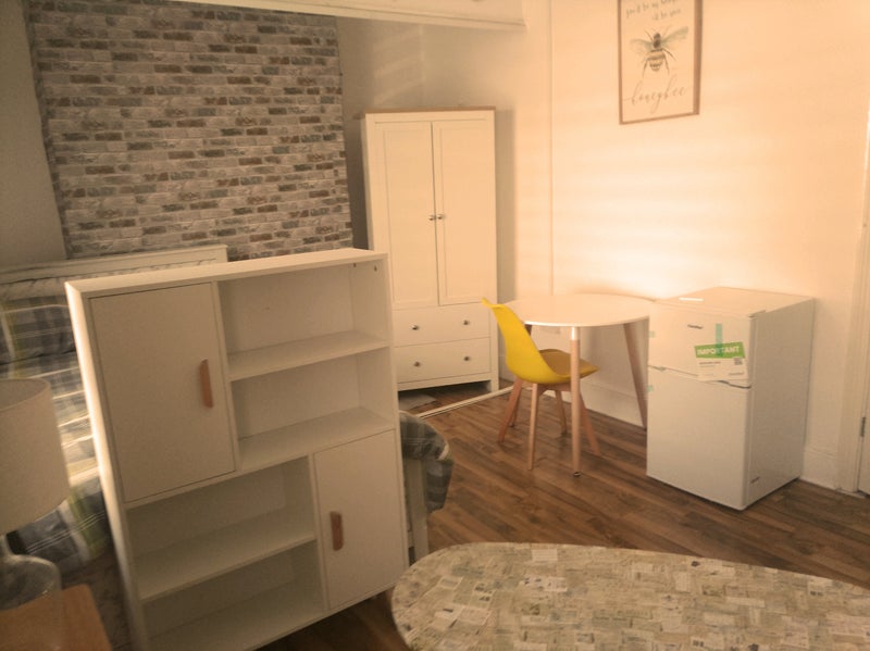 ✅Zoned areas with new furniture to give a modern contained studio feel which includes a reclining armchair, living room storage, side table and lamp and foldable over armchair desk/ workstation on wheels for laptop, there is currently no TV but one can be provided if you need it.