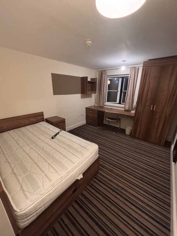 The room is very large and comes with a chest of drawers, large desk, wardrobe, and two mirrors. There is a pristine double-bed and an en-suite bathroom fit with a shower and bath. The room locks.