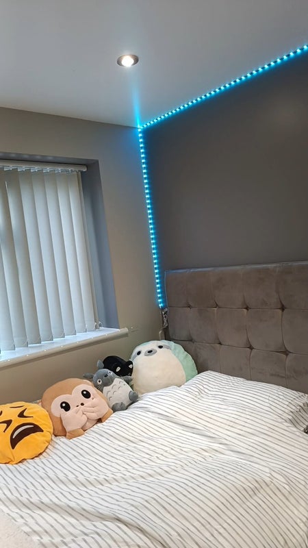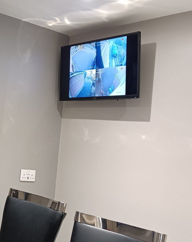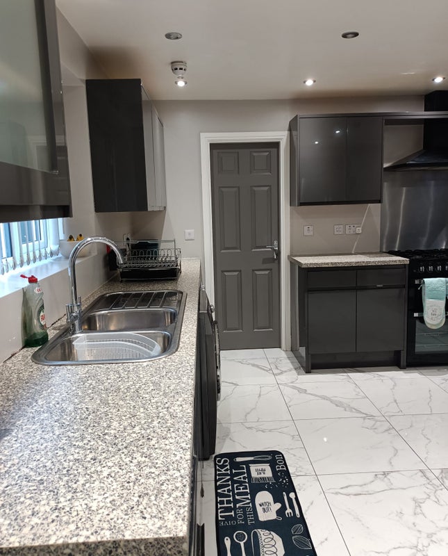 The bedroom is on the ground floor next to the kitchen, and comes with a small double bed, private en-suite shower room and pre-installed LED strip lights. The kitchen is a bright, modern communal space, with a washer, dryer, large TV and CCTV. We also have a driveway and a small concrete backyard with a security gate.