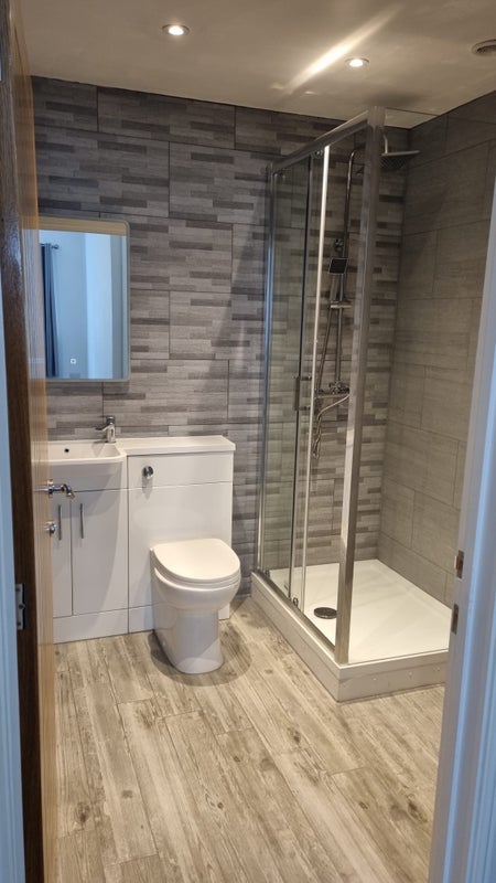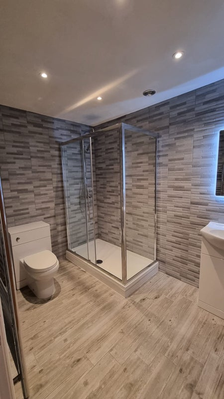 TWO Large bathrooms with sliding door shower enclosures, vanity units and LED mirrors.