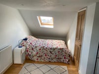 Lovely attic double room with en-suite in Walthamstow. The room is spacious and includes a desk and storage. It’s very light, with a Velux skylight and small window overlooking the garden.