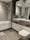 The bathroom has a spacious bathtub and shower head, sink with mirror cupboards and under-sink storage.