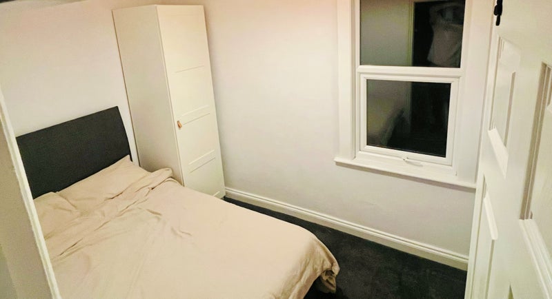 Brand new bed (small double), mattress & bedding. Bedside table with lamp and clothes rail. TV inc Netflix and Prime.