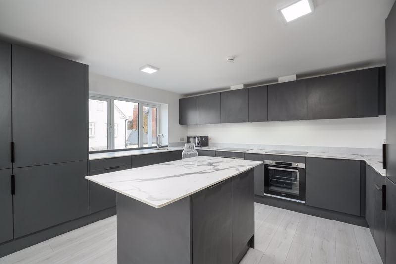 The kitchen is not only stylish but also incredibly spacious, fitted with ample storage units and appliances.