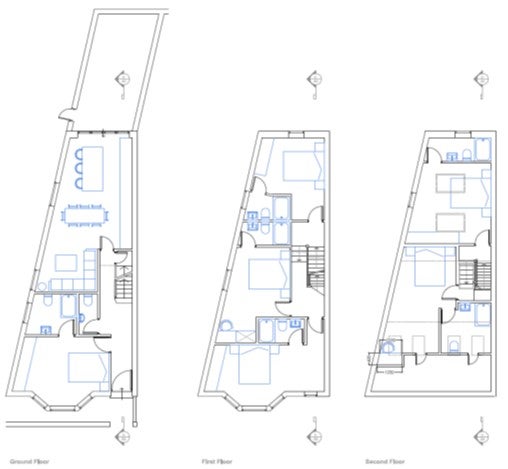 The ensuite rooms are located on the ground floor, and on the first floor towards the front and on the top floor of the house.