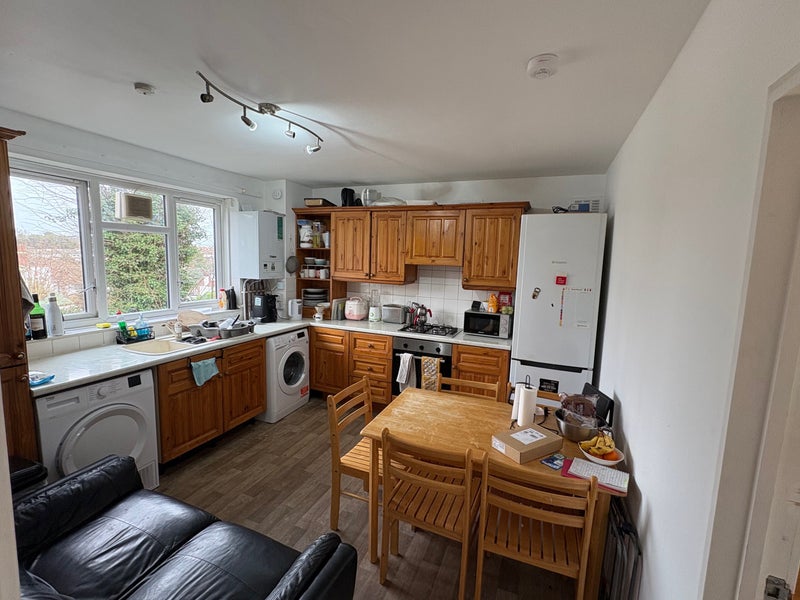 Spacious kitchen with plenty of cupboard/fridge space, dining table/chairs and small sofa, tumble dryer.