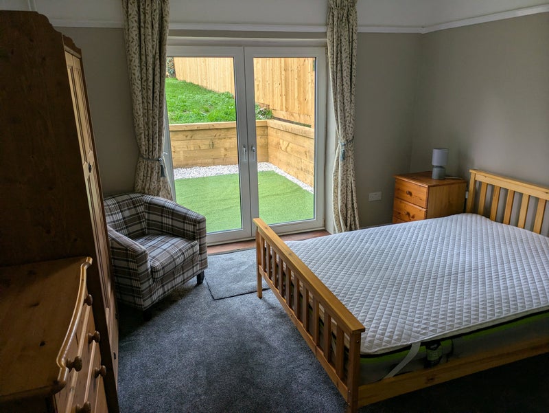 A garden-facing 15 sqm room with new carpets, double bed, dresser, stylish wardrobe, chest, easy chair & a new enclosed artificial lawn patio. This is not overlooked and leads via steps out onto the extensive private garden.