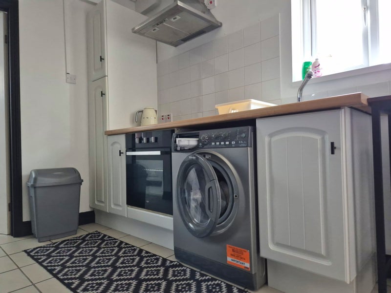 To the other end, where the kitchenette is ready for you to cook up 🍳something saucy and sit to scran at the breakfast bar. Oven and hob with extractor, full size fridge-Freezer - all there to cover your cooking needs and food and drink storage. You've got ample cupboard space to yourself too!(we've provided some basic crockery and utensils but you can use your own if you prefer. There's even a sink and draining board to wash all your fancy cups and plates in.) A decent washing machine & line space mean you can stay looking fresh and clean without waiting for someone elses cycle to finish while you stand there panicking about being late, in your bath towel or undercrackers.