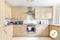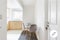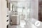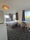 Modern Bathroom, kitchen separate from living room. Smart TVs all wall mounted.; 55 inches TV in living room