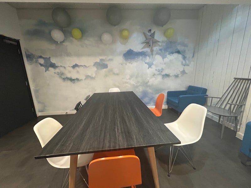The apartment features a shared kitchen and dining space, well equipped with an induction hob, electric oven, microwave, air fryer, kettle, hoover, mop, mop bucket, foldable tables, chairs and ample cupboard and fridge/freezer space.