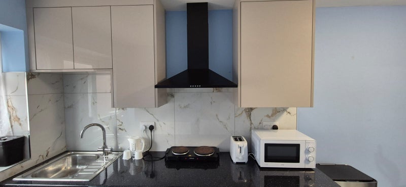 - The kitchen is fully fitted with all amenities: a fridge, freezer, kettle, washing machine, and other essentials.