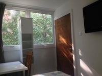 This is a bright double bedroom overlooking a quiet, charming street with trees. The double bed has a superb high quality orthopaedic mattress. There is a built in wall wardrobe with hanging rail, shelves and full length mirror, desk and chair and large wall mounted TV